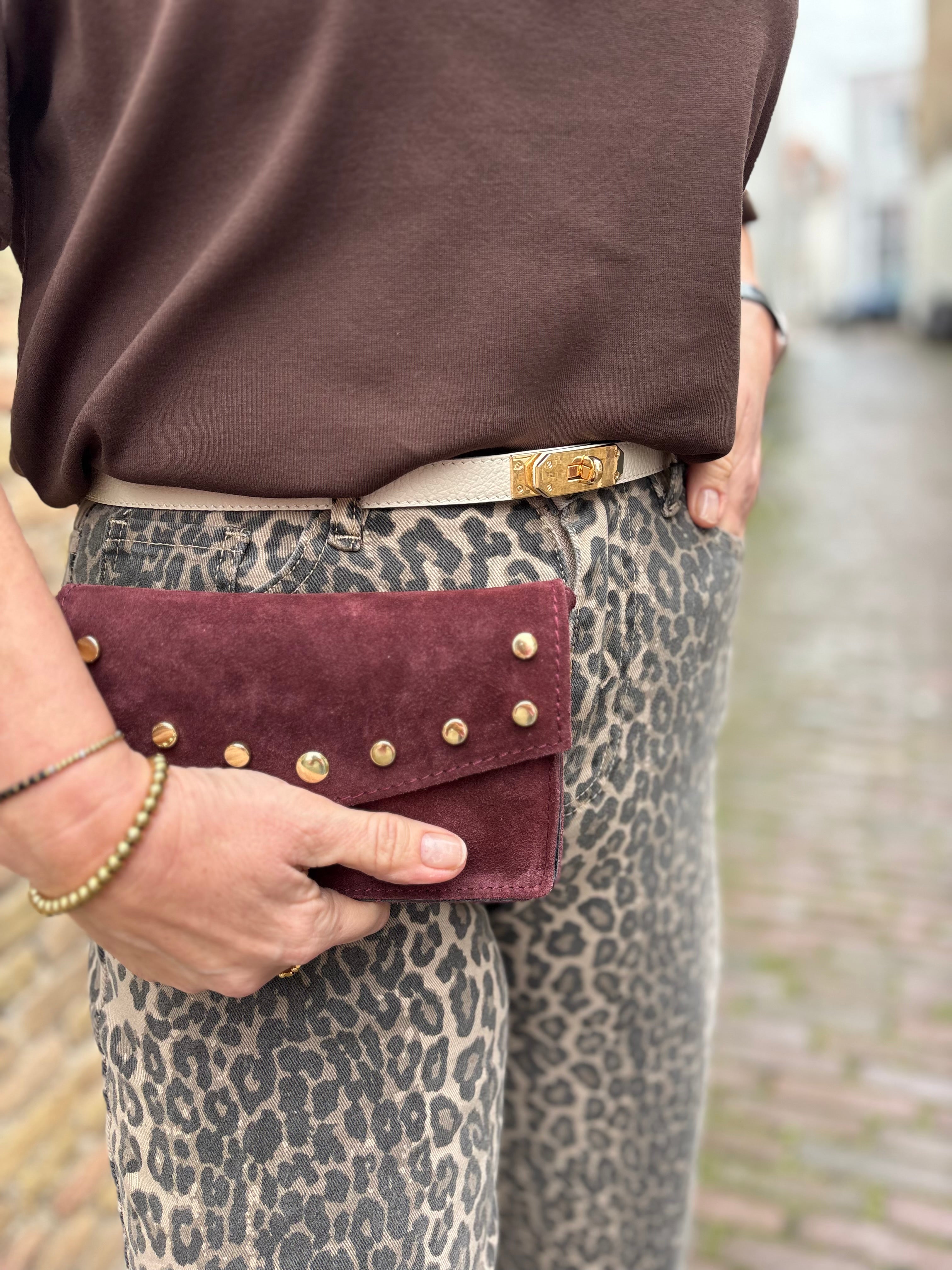 Bordeaux suède leren tasje met gouden studs op de voorzijde. Voorzien van een lange schouderband en een extra binnenvak met rits. Gemaakt van echt leer en perfect voor een stijlvolle, vrouwelijke look.