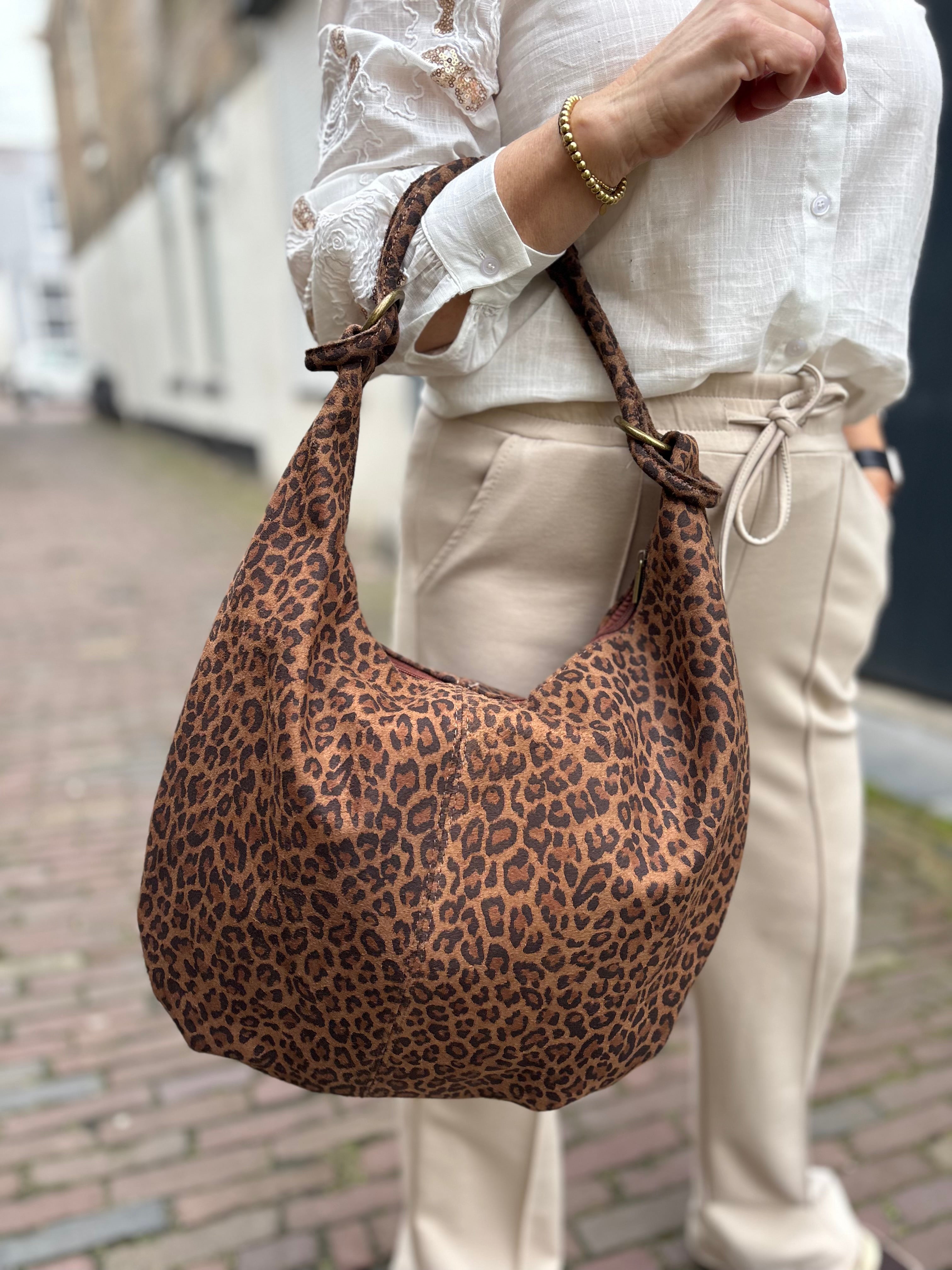 Deze toffe tas van echt leer met leopard print is een echte statement piece. De tas is ruim van formaat en sluit veilig met een rits. Aan de binnenkant vind je een handig telefoonvakje en een extra klein vakje met rits voor je sleutel en portemonnee. De schouderband is afgewerkt met koperen ringen aan de zijkanten, wat de tas een stoere en luxe uitstraling geeft. Perfect voor dagelijks gebruik én om je outfit net dat beetje extra te geven.