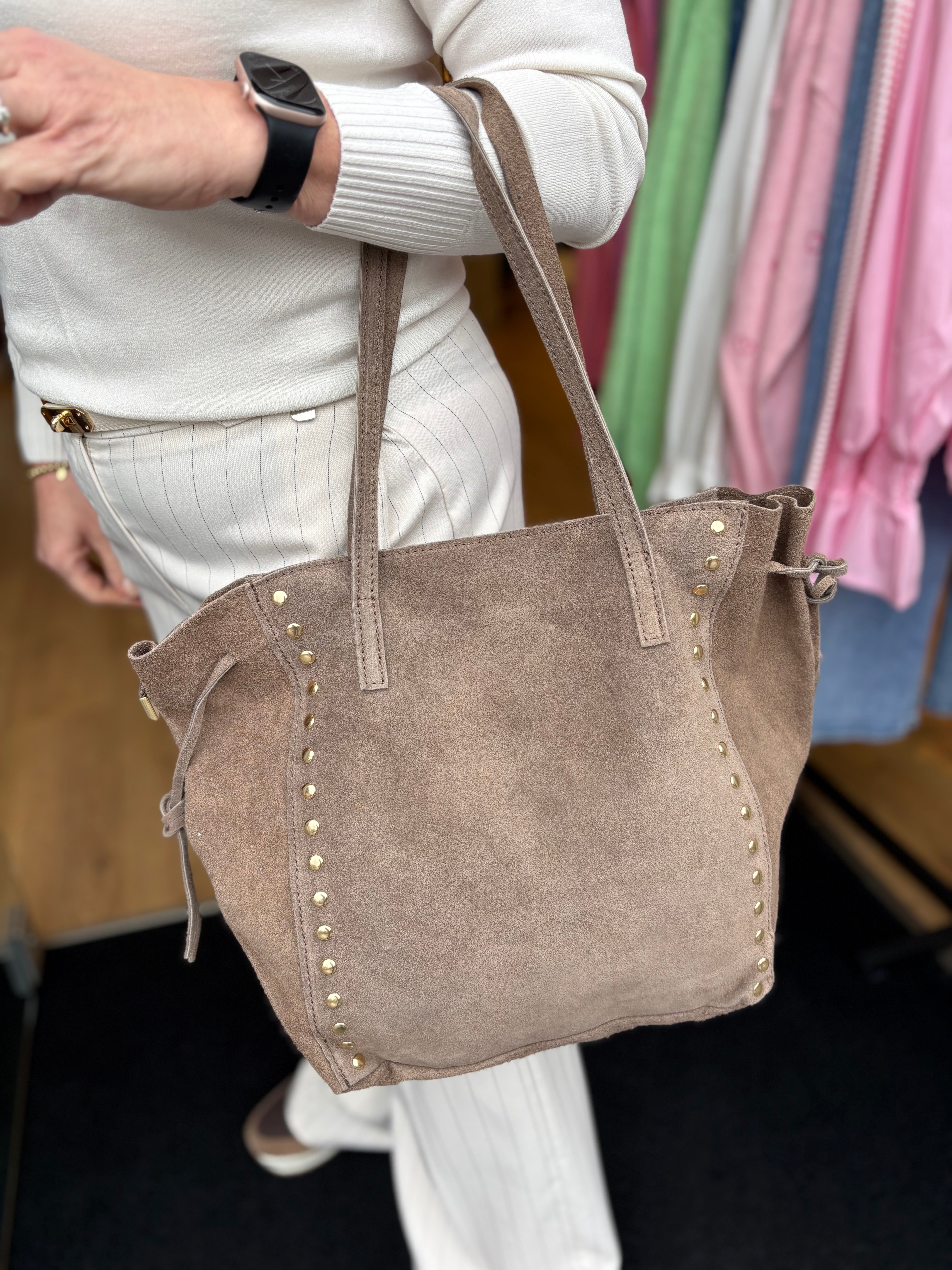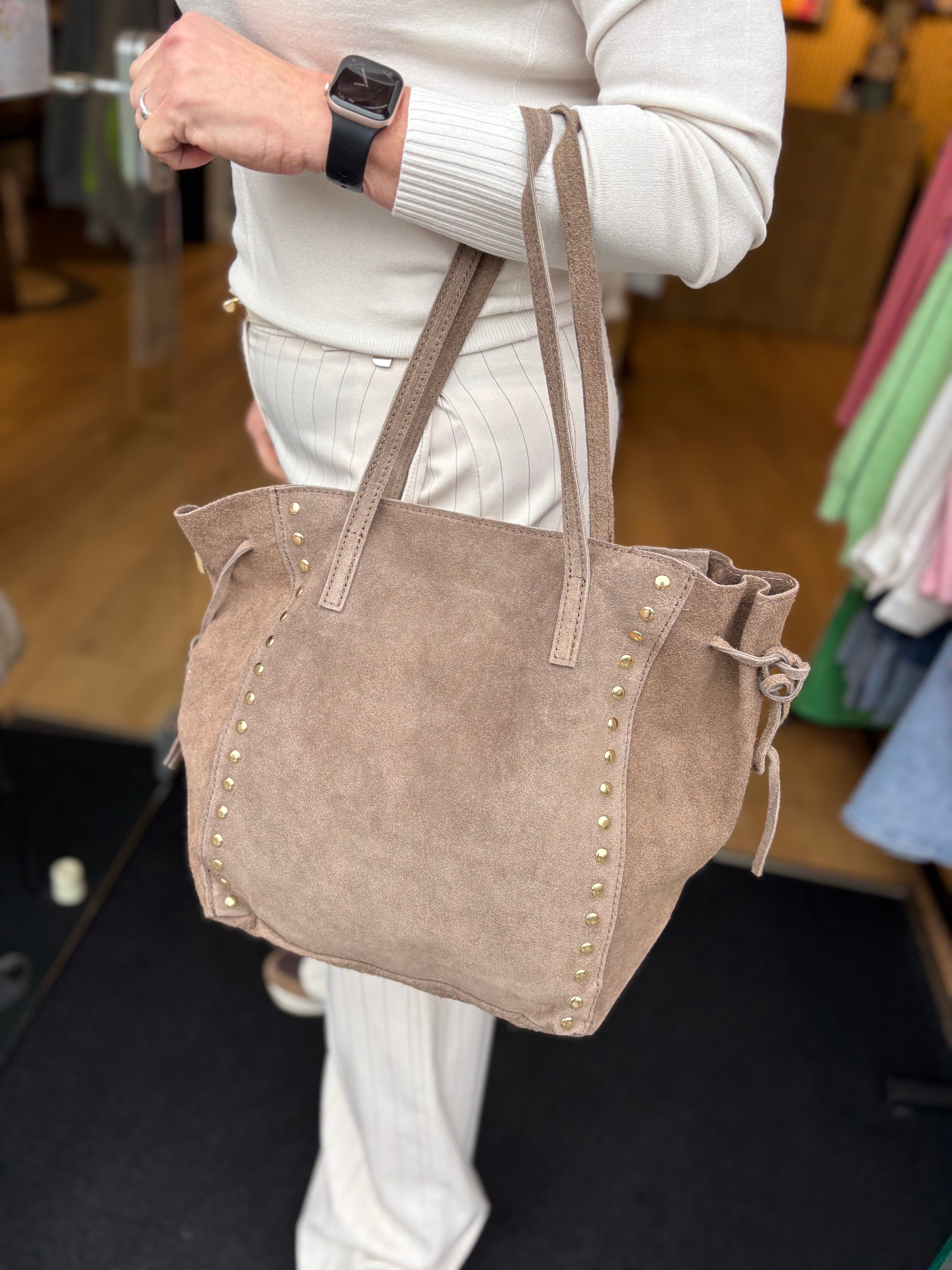 De tas beschikt over één ruim hoofdvak dat sluit met een rits, waardoor je spullen veilig opgeborgen zijn. Aan de voorkant geven de gouden studs de tas een speels en trendy detail. Aan beide zijkanten zitten twee leren koordjes in dezelfde kleur, wat zorgt voor een extra leuke afwerking.