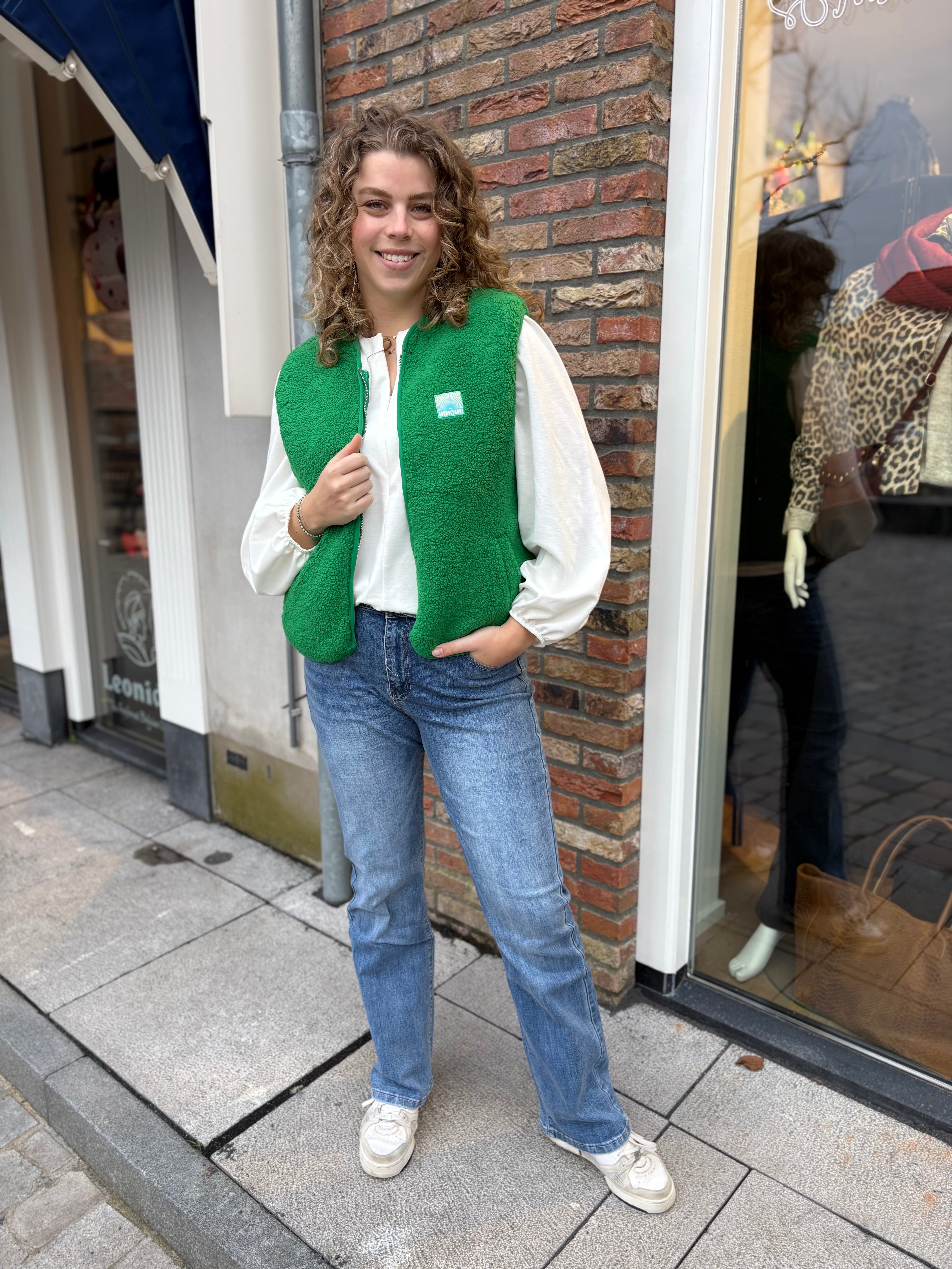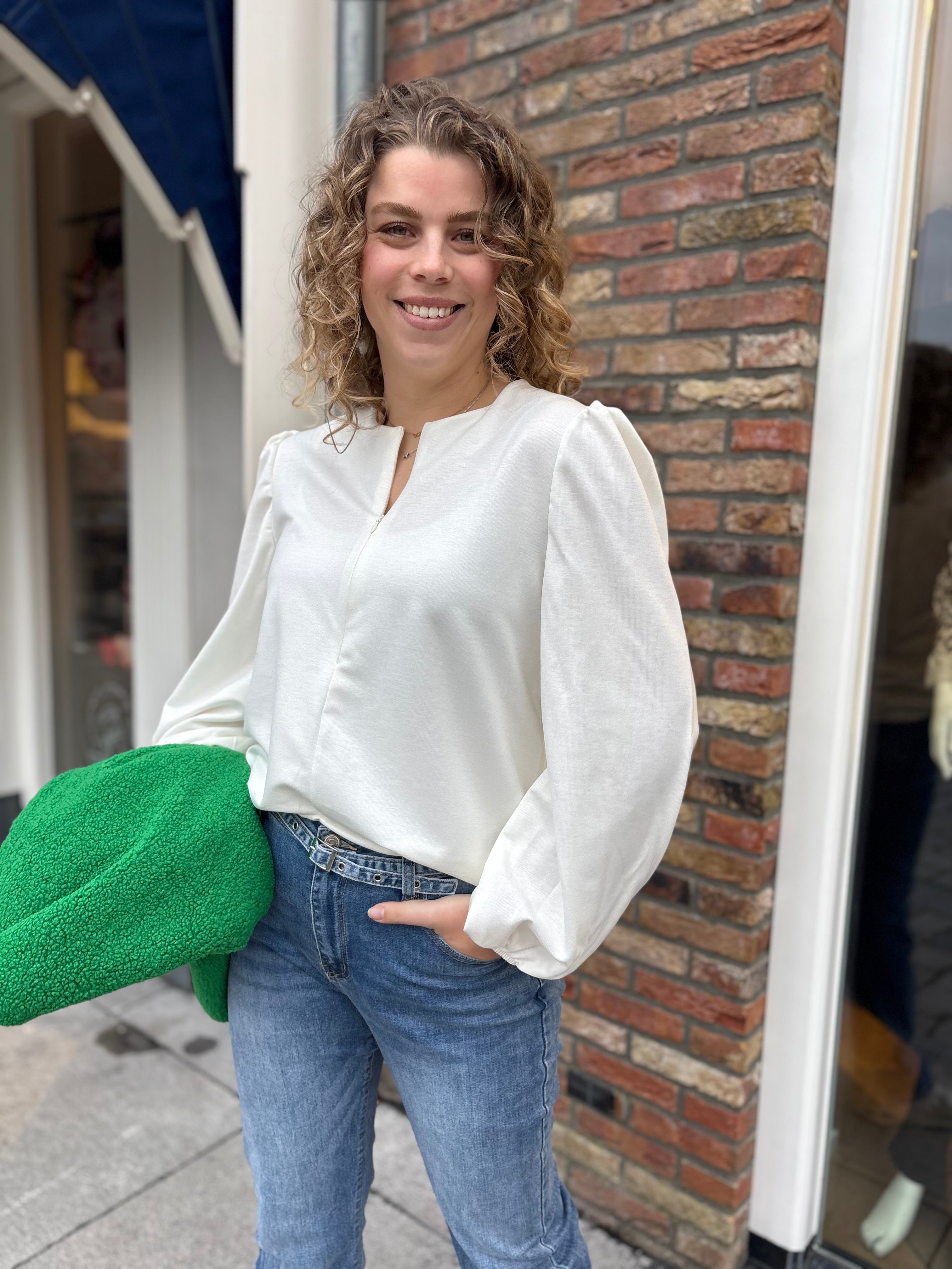 Deze blouse van Azzurro is gemaakt van een heerlijk zachte stof en uitgevoerd in een elegante off-white tint. De ronde hals met subtiel ritsje aan de voorkant geeft de blouse een verfijnde uitstraling. De mouwen hebben een kleine pof en zijn afgewerkt met een elastische band aan de onderkant voor een speels detail. De blouse valt goed op maat en draagt heerlijk comfortabel.