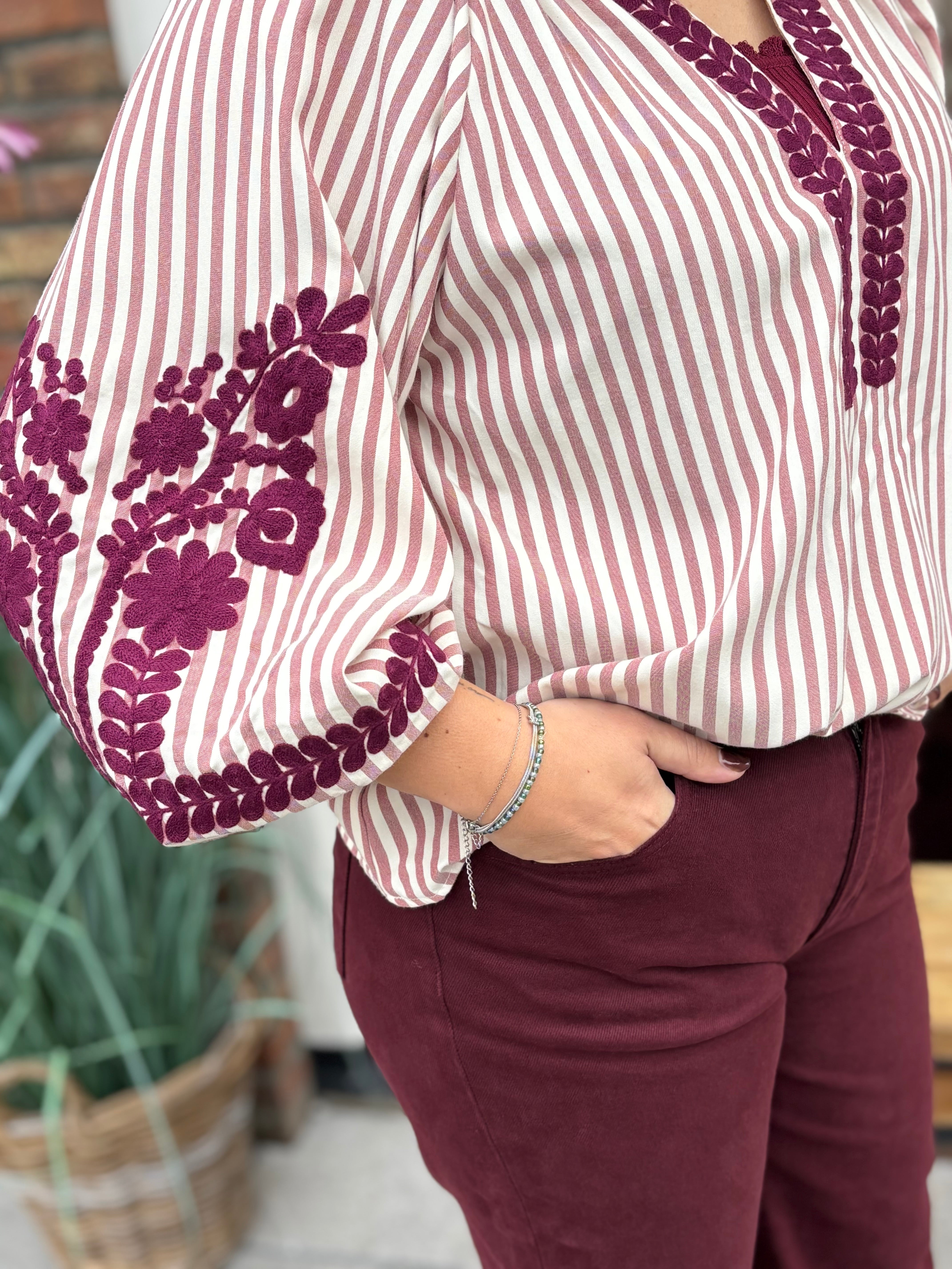 Deze 100% katoenen blouse is een verfijnde eyecatcher met een prachtige ecru/bordeaux streep. De diepe V-hals is elegant afgezet met een subtiele borduurprint, wat de blouse een unieke en vrouwelijke uitstraling geeft. De iets kortere, wijdvallende mouwen zorgen voor een luchtige look en zijn laag op de mouw versierd met een extra mooie print. Een perfecte combinatie van comfort, kwaliteit en boho-chic stijl ideaal voor zowel casual als meer geklede momenten.