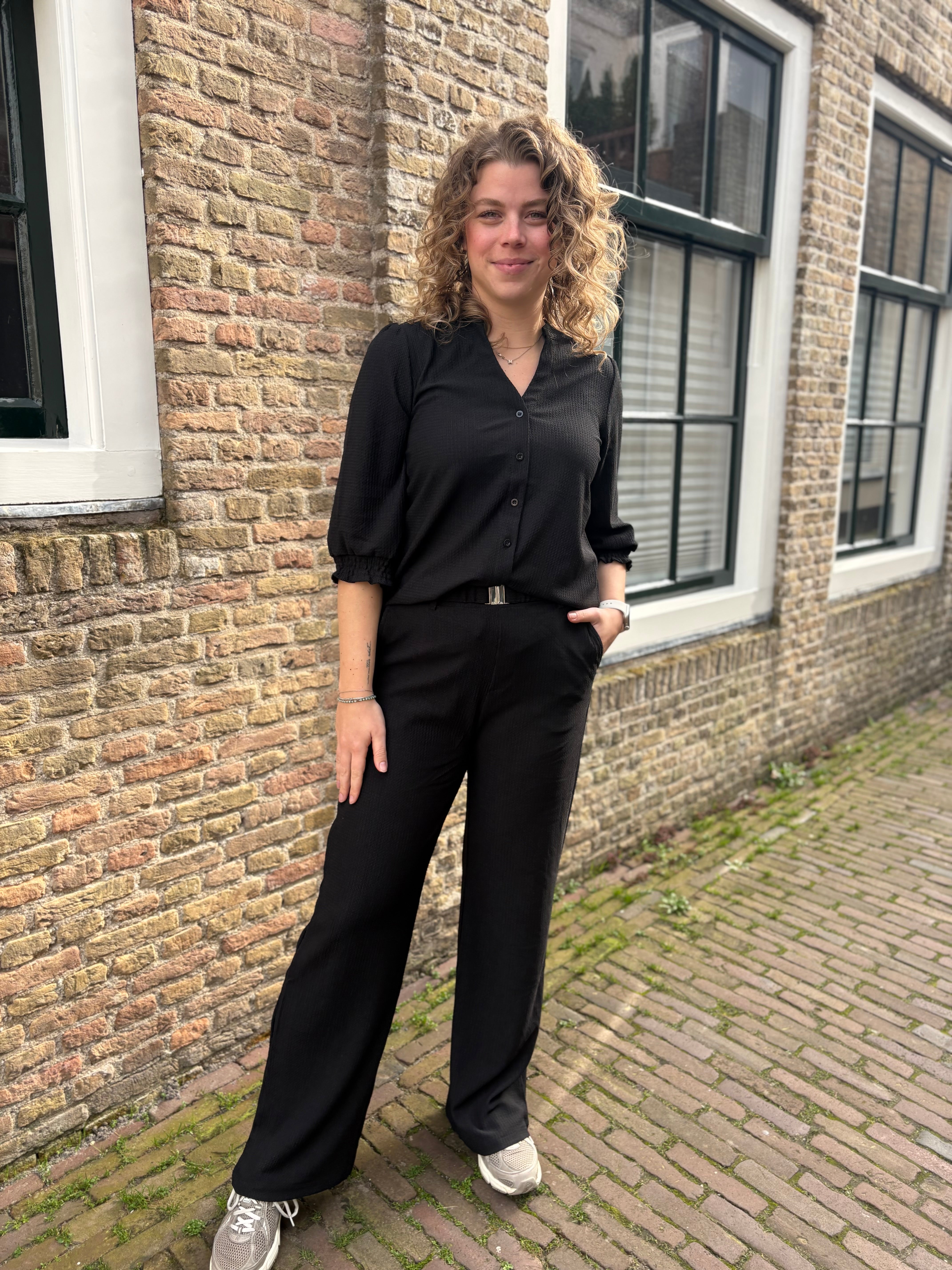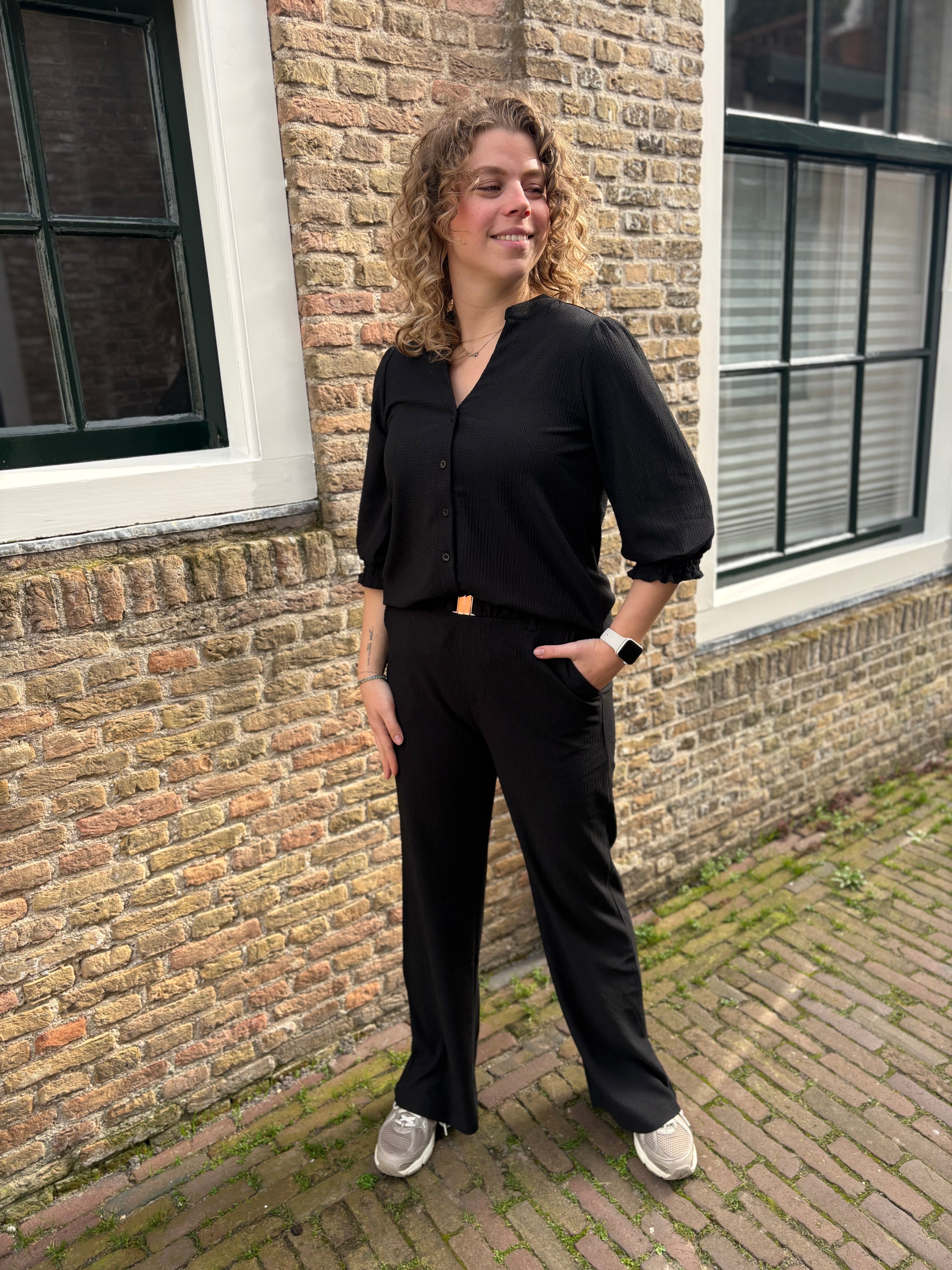 Combineer de blouse met de bijpassende broek voor een complete en stijlvolle set, maar draag hem ook gemakkelijk op een jeans of rok.
