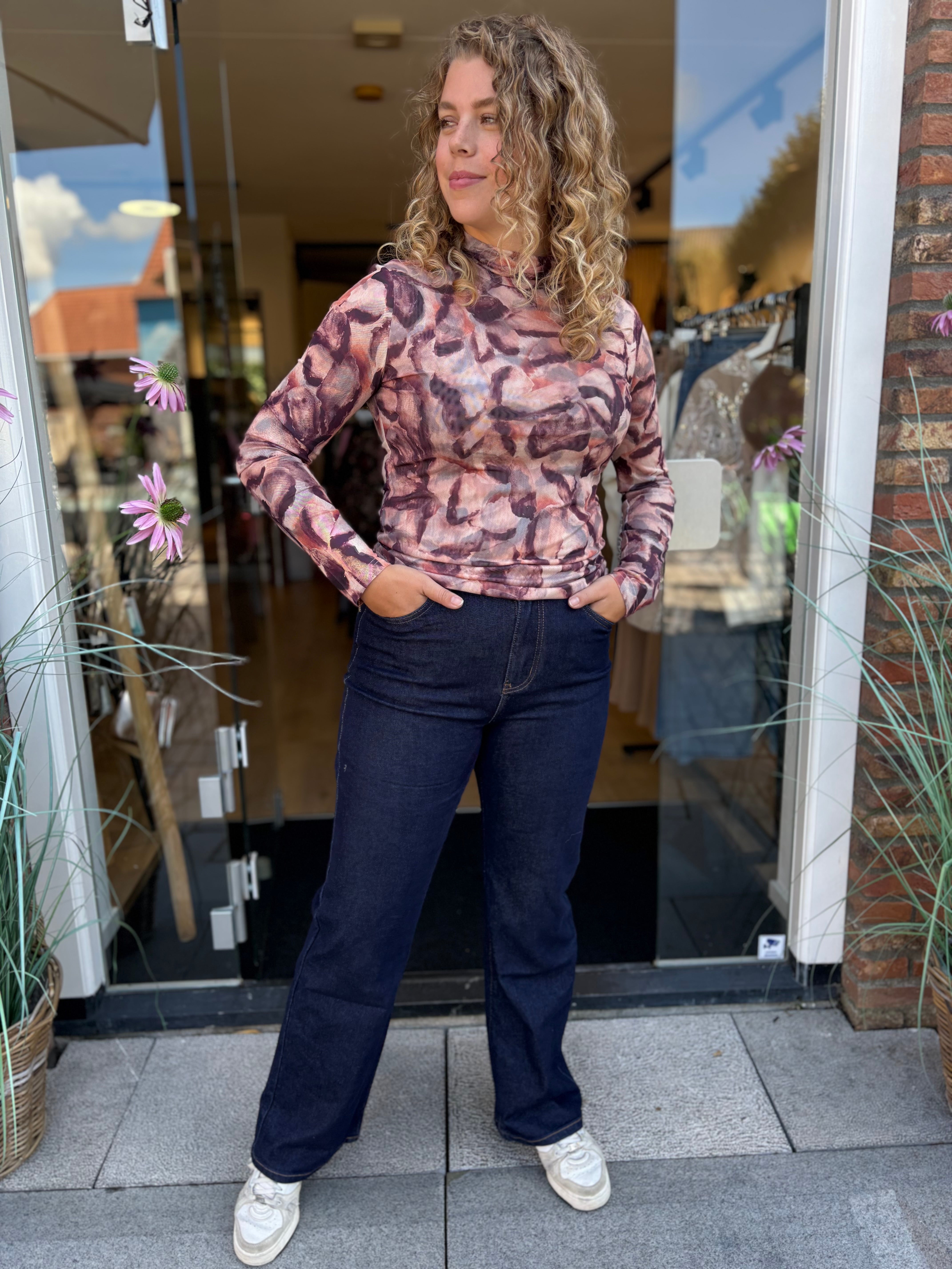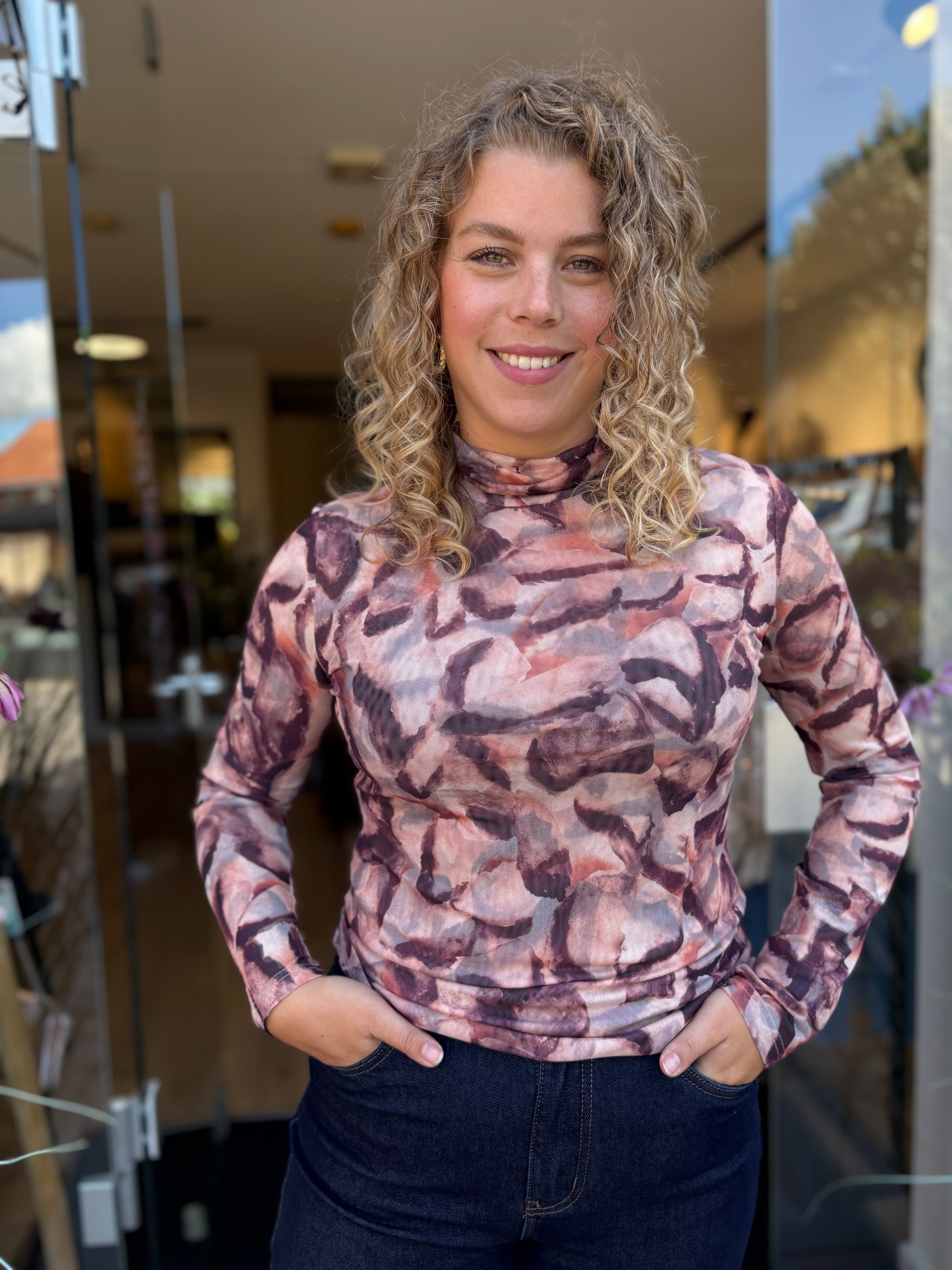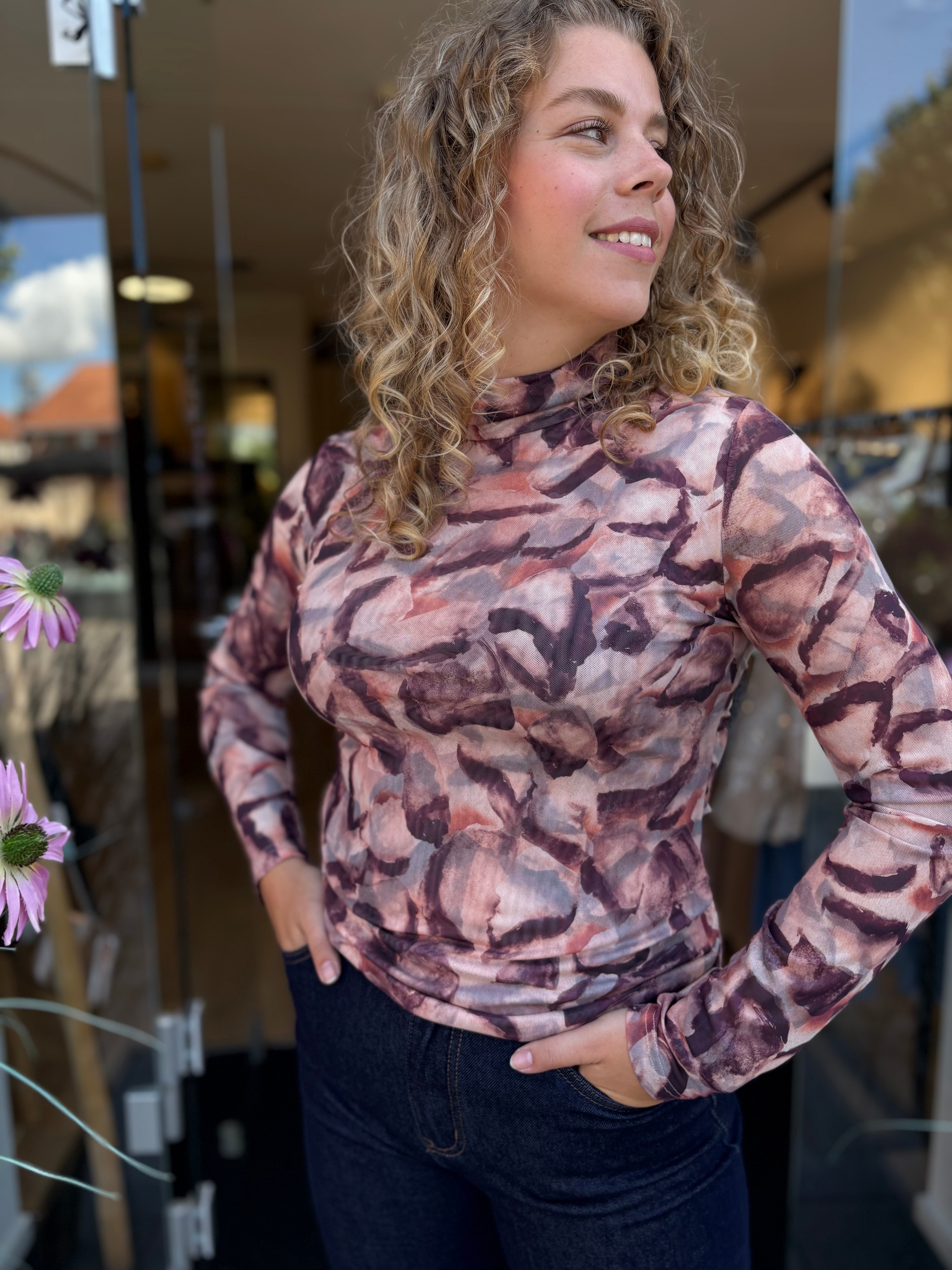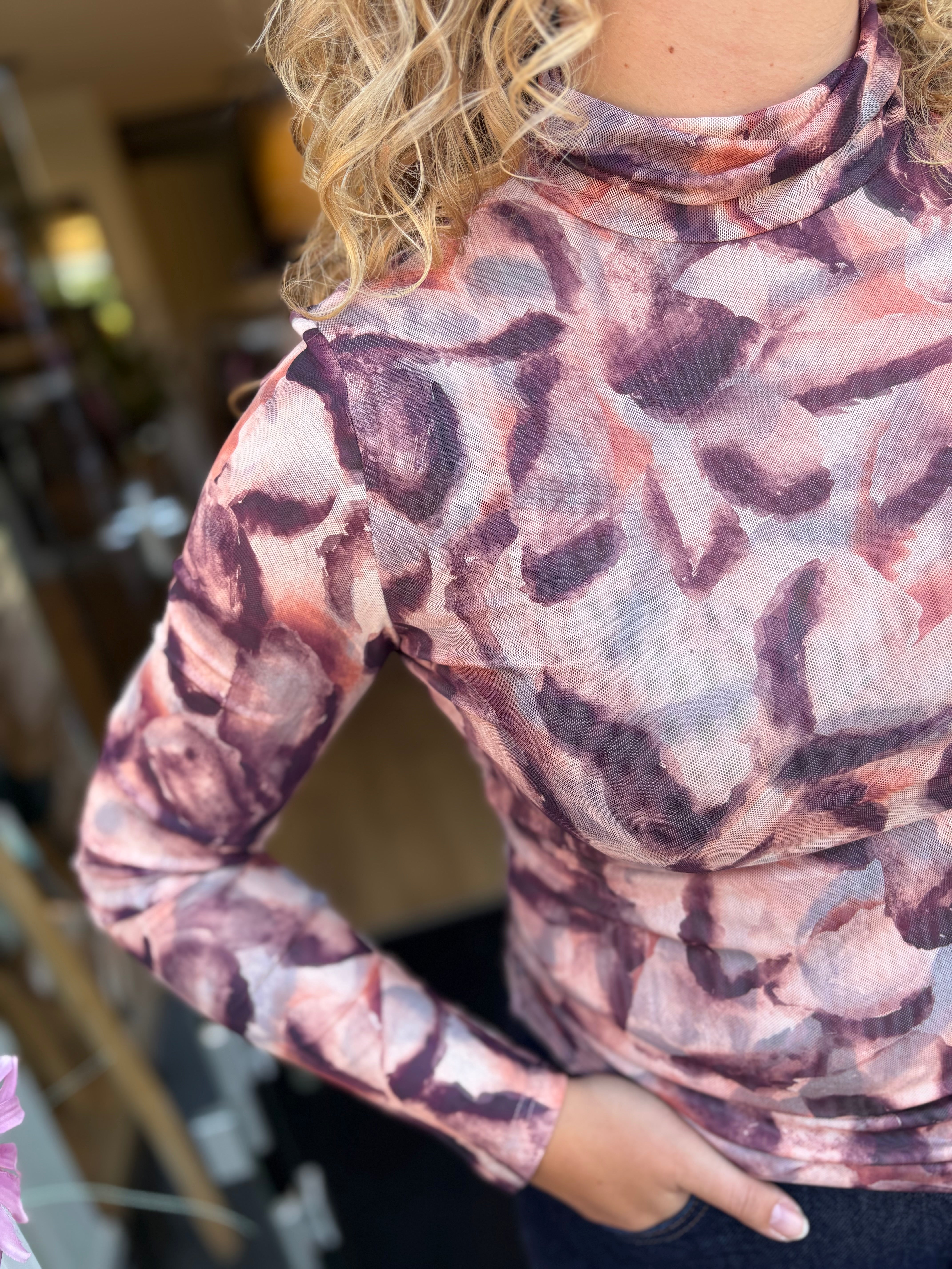Laat je omhullen door rijke, herfstige kleuren met deze elegante mesh top. In een prachtig samenspel van bordeaux, aubergine, zachtroze en diepbruin straalt deze top warmte en verfijning uit. Het aansluitende silhouet flatteert je figuur en voelt als een tweede huid, terwijl het zachte turtle halsje een subtiele touch van klasse toevoegt