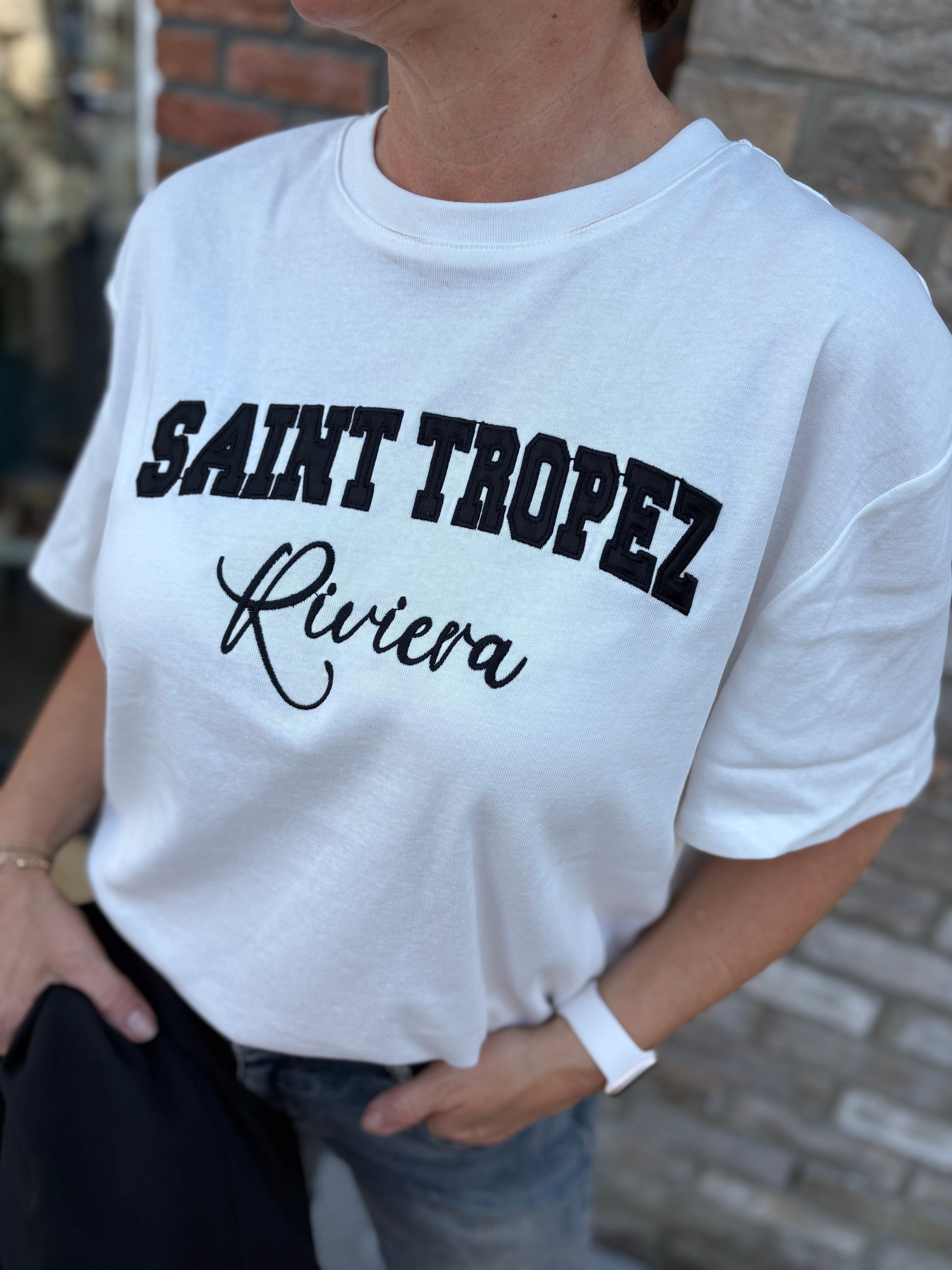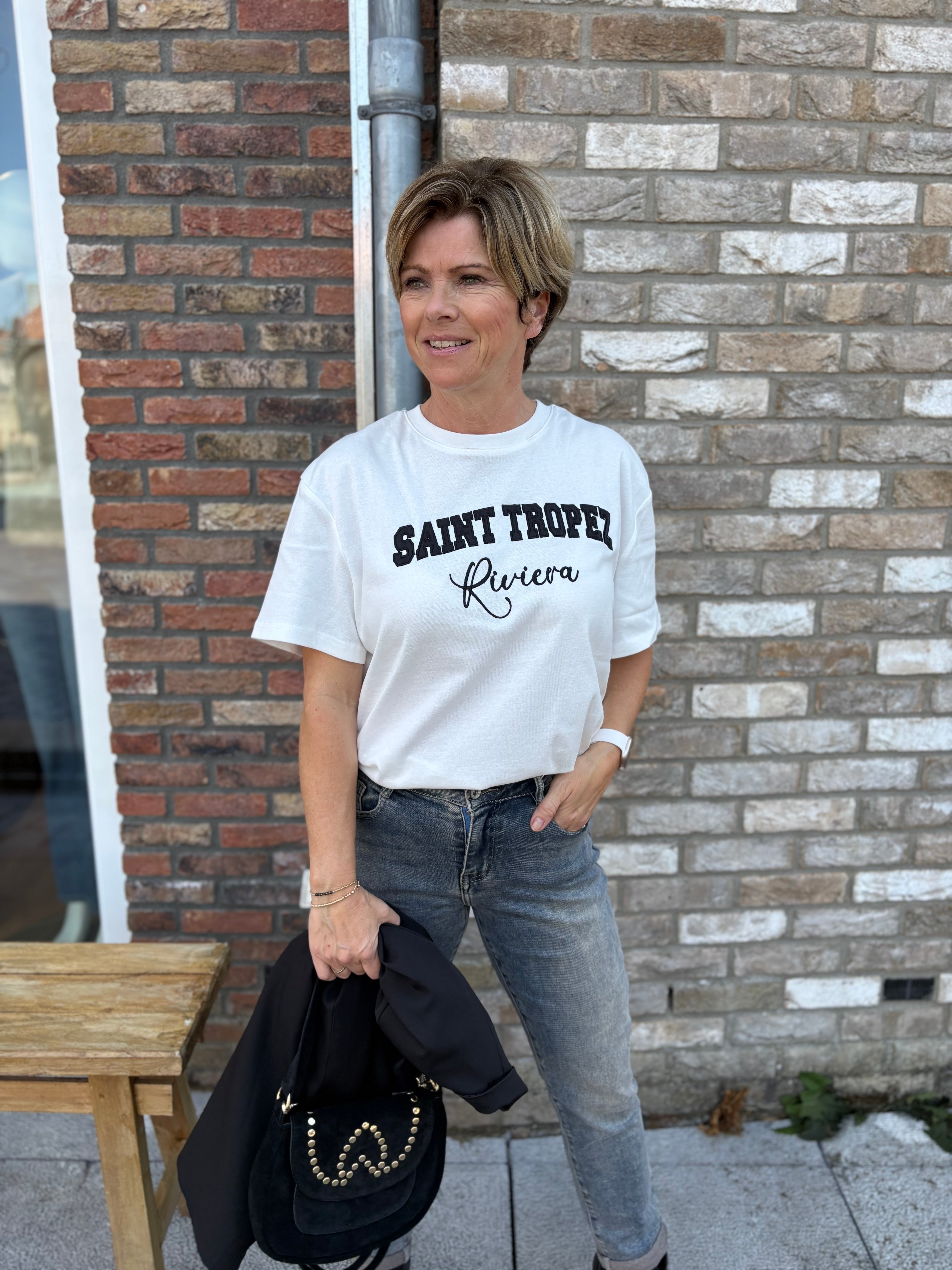 Casual chic met een Franse touch! Dit witte T-shirt is one size (geschikt voor maat 36 t/m 42) en zit heerlijk luchtig. De zwarte Saint Tropez-tekst op de borst is niet geplakt, maar mooi vastgestikt voor een kwalitatieve en duurzame afwerking.