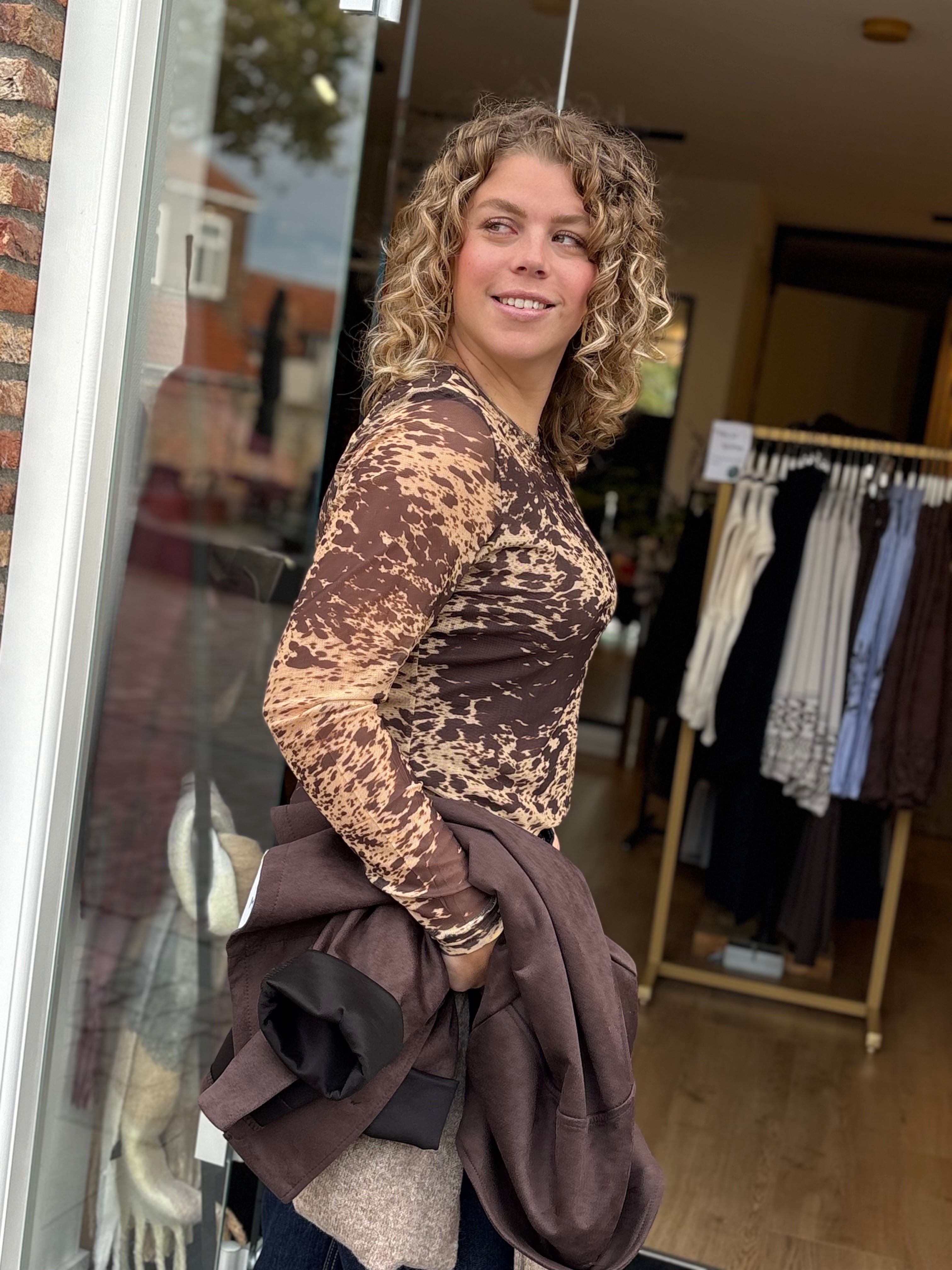 Statement alert! Deze mesh top met camel en bruintinten geeft jouw outfit direct een trendy touch. De doorschijnende mouwen zorgen voor een speels effect, terwijl het gevoerde lijfje alles bedekt wat bedekt moet blijven. Combineer met een leren broek of denim voor een tof effect. Top valt goed qua maat.