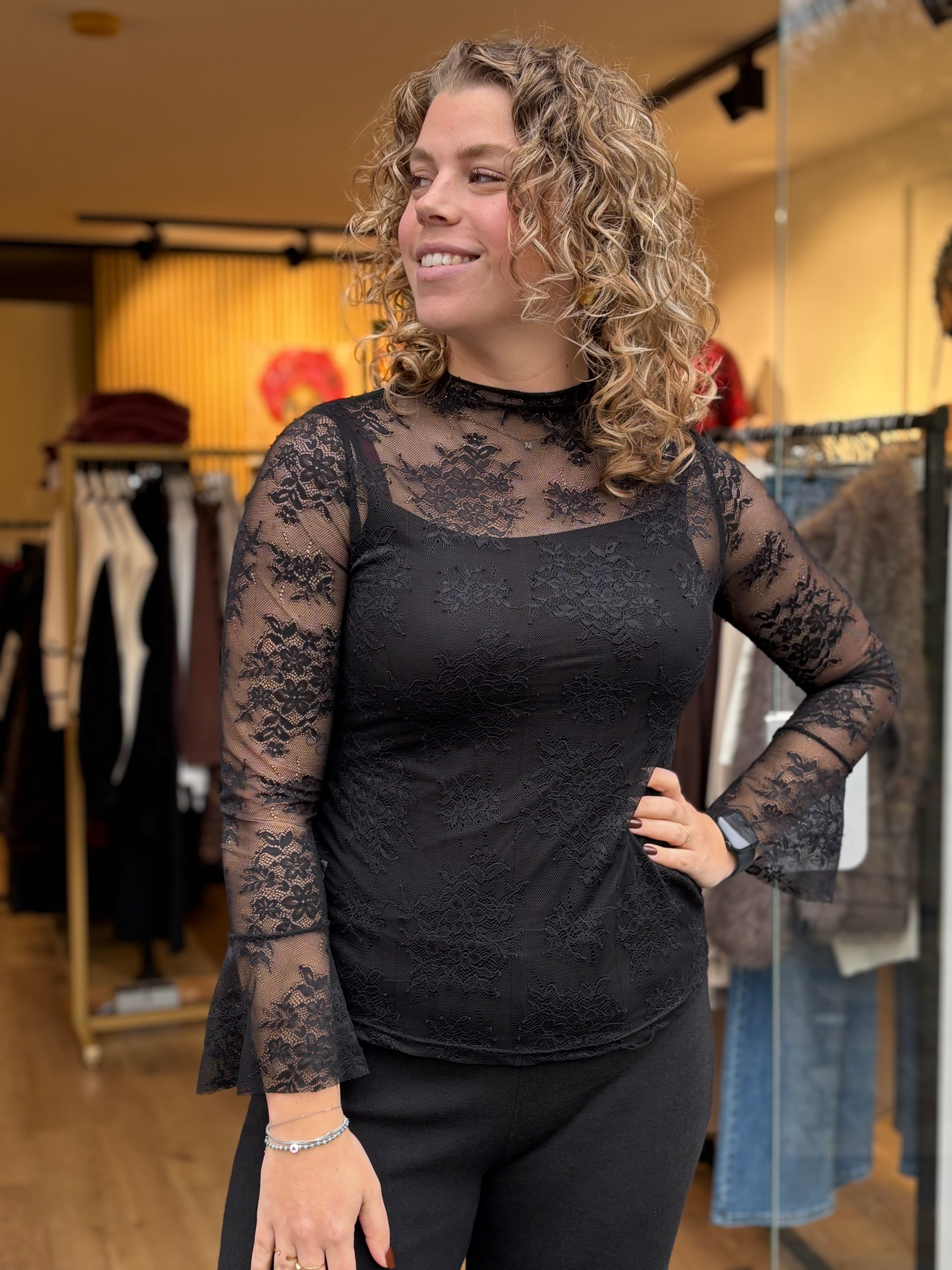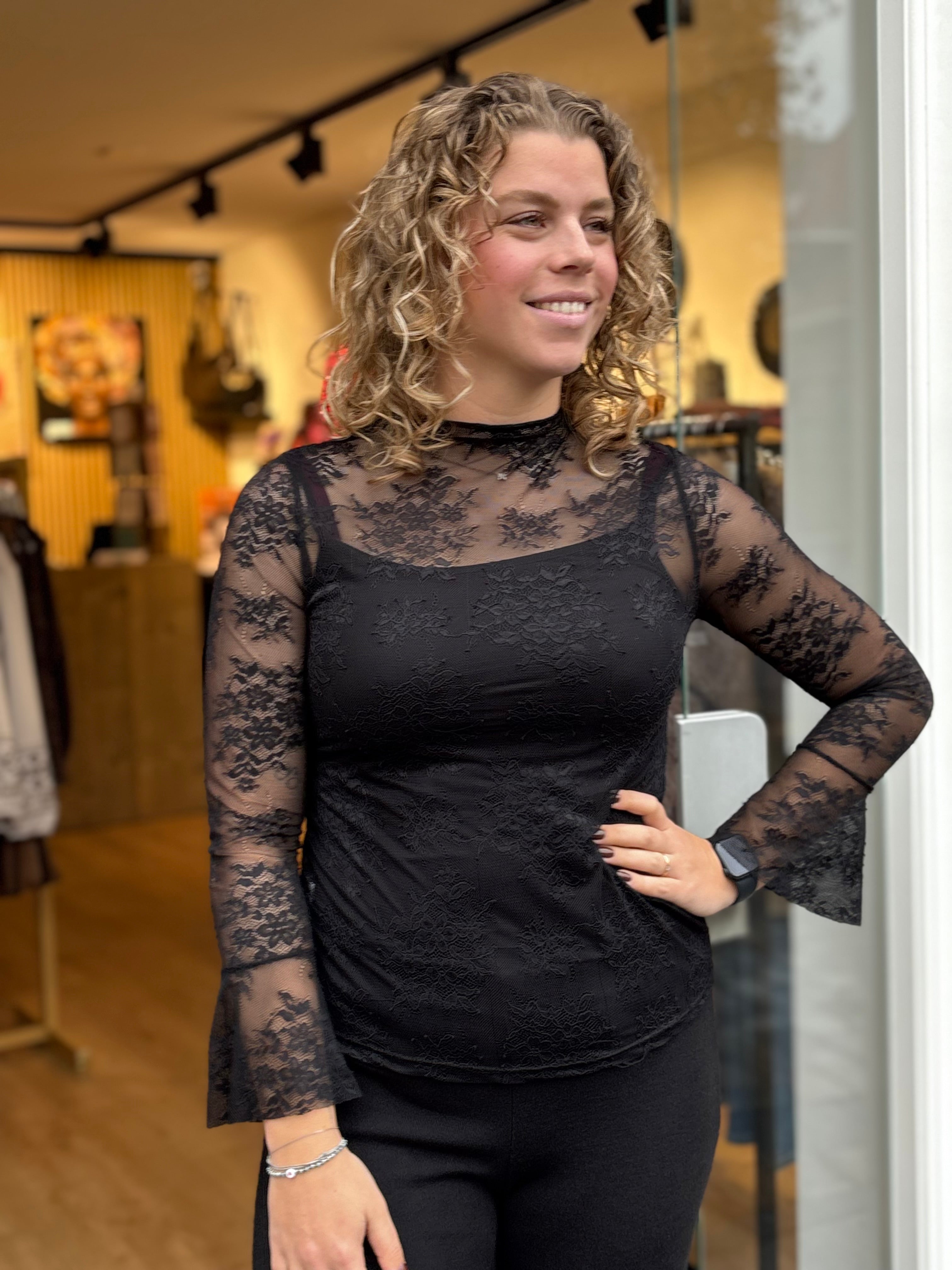 Voeg een vleugje feestelijk toe aan je outfit met deze stijlvolle zwarte kanten top. De fijne kant zorgt voor een vrouwelijke en chique uitstraling, terwijl de comfortabele one-size pasvorm geschikt is voor maat 36 t/m 40.