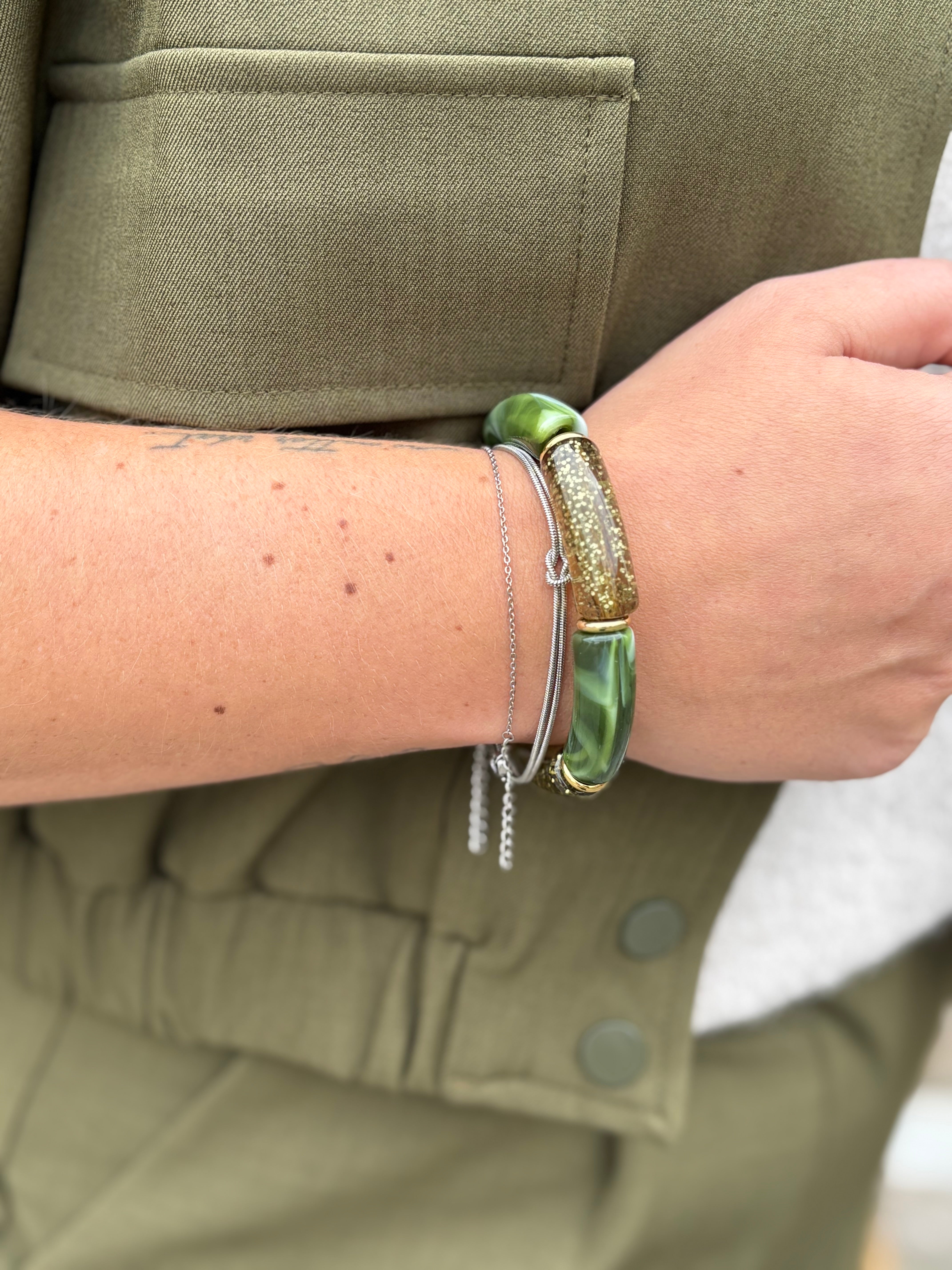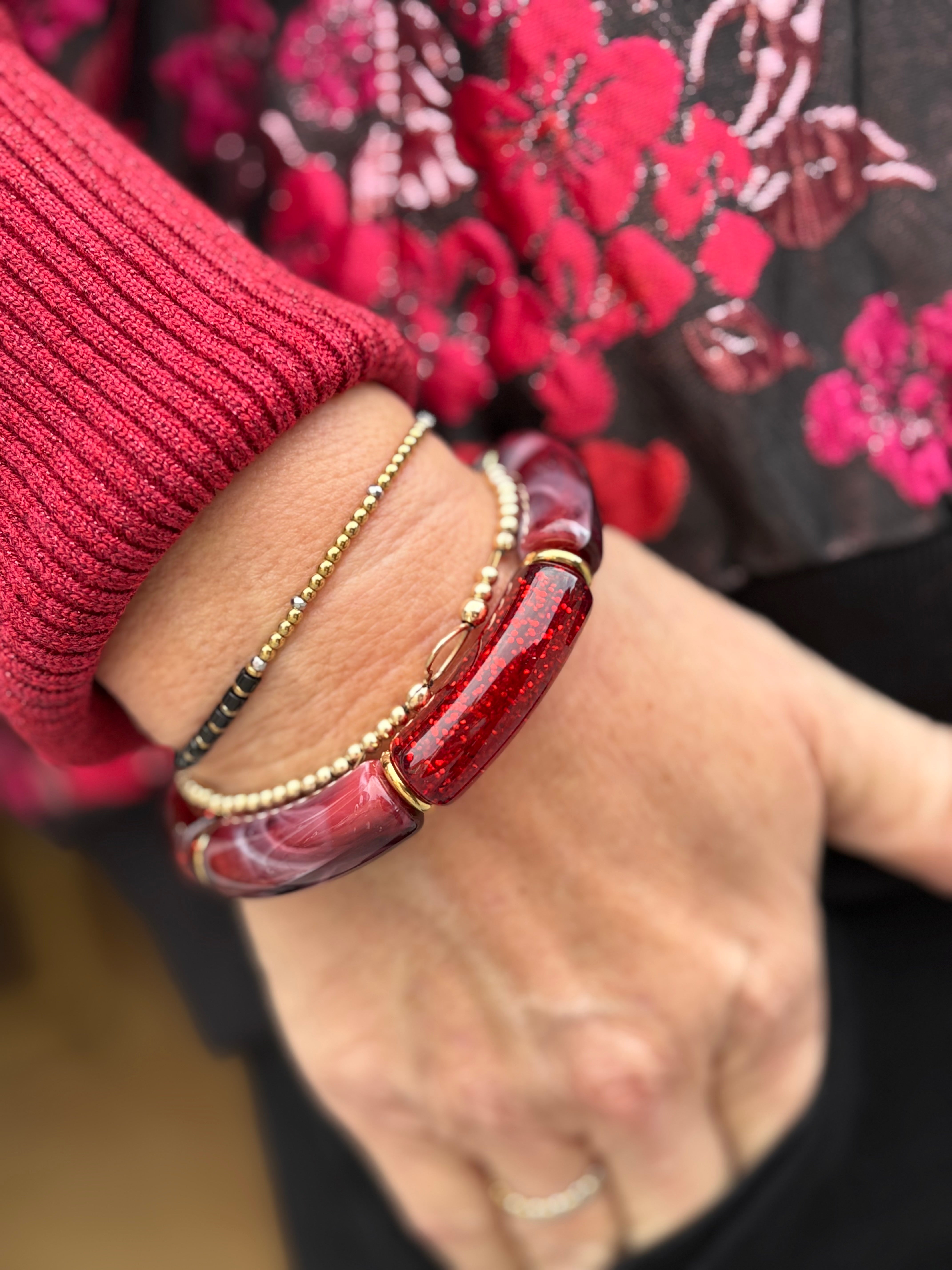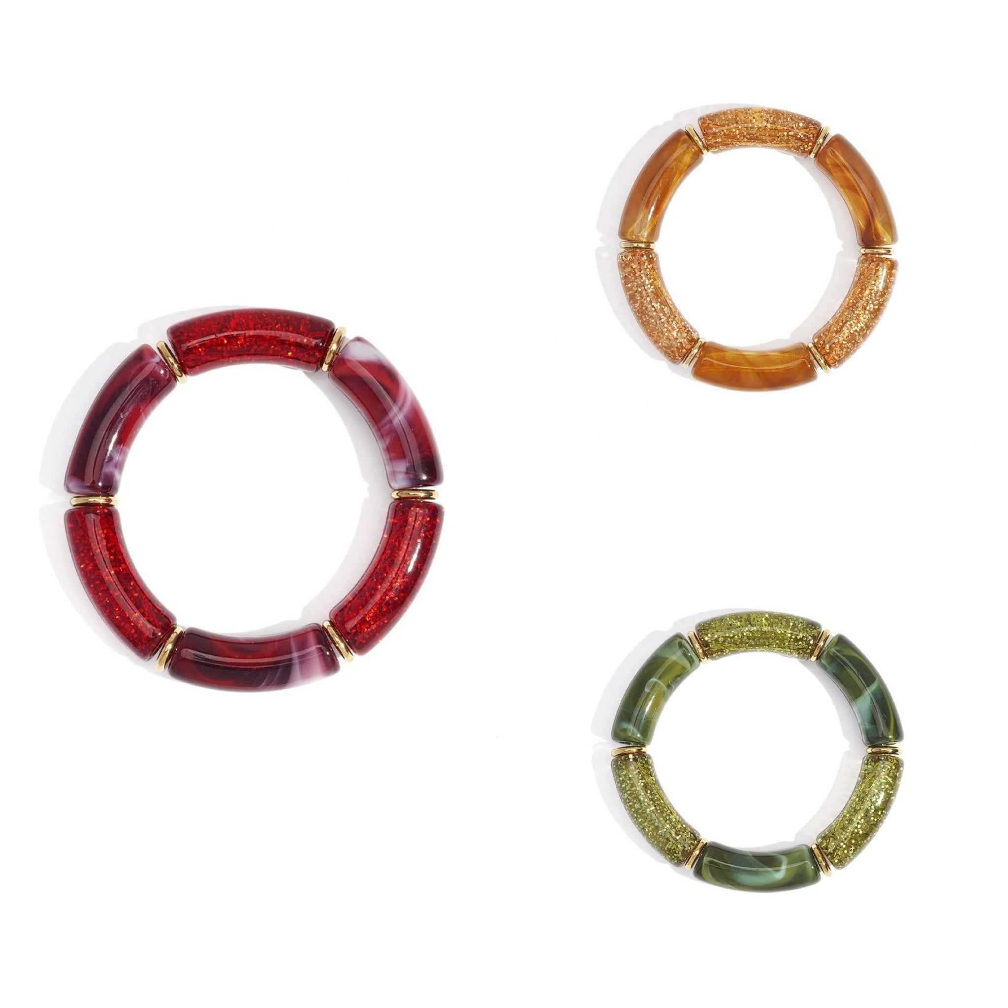 Onze elastische armbanden in groen, goud en rood zijn de perfecte mix van kleur en glamour. Elke armband bevat een subtiele glitter schakel en een kleurrijke accent schakel stijlvol omlijst met gouden stainless steel ringetjes. Draag ze solo voor een verfijnde look of mix & match voor een speelse twist. Tijdloos, elegant en met een comfortabele pasvorm dankzij het elastiek.