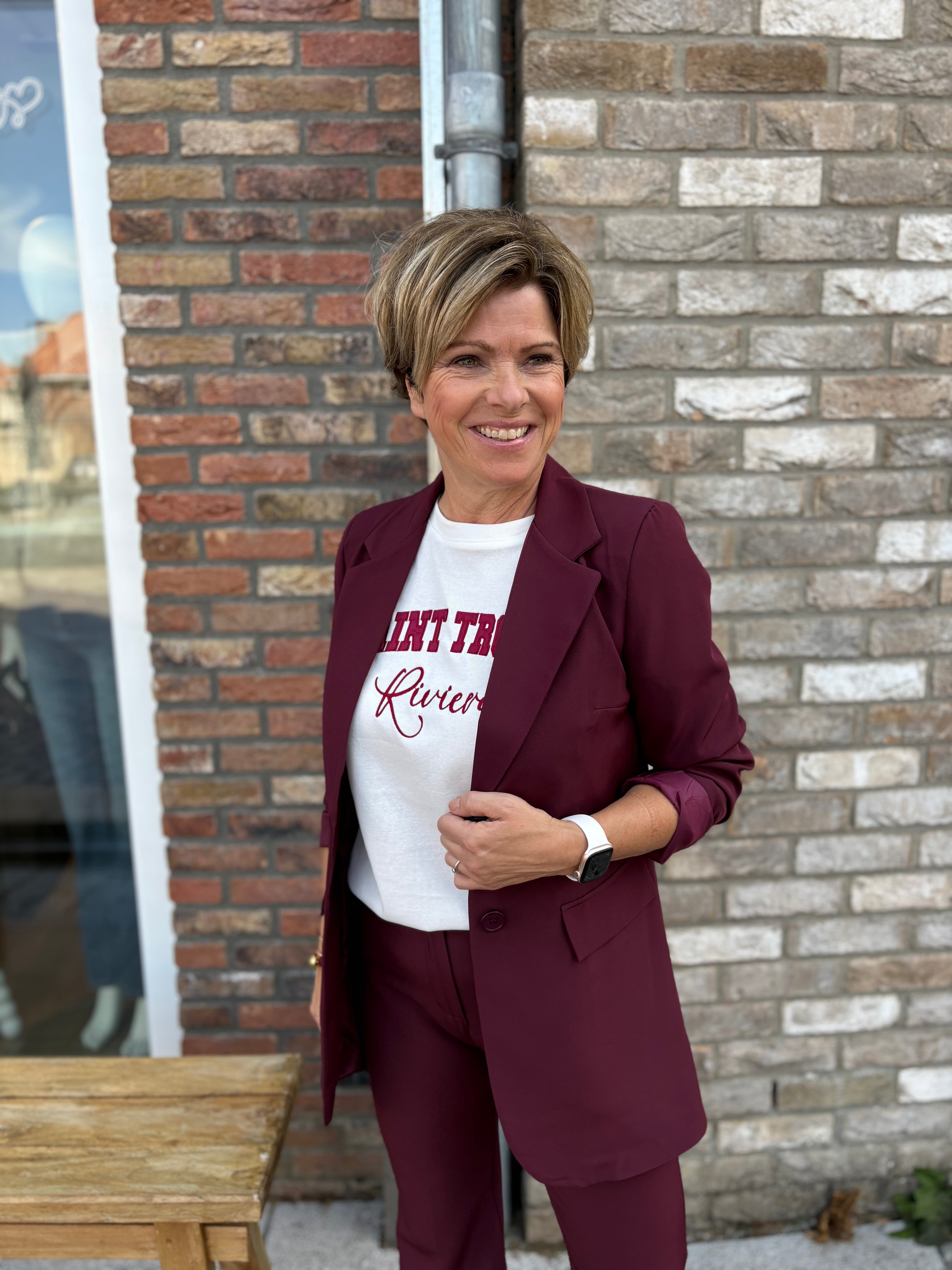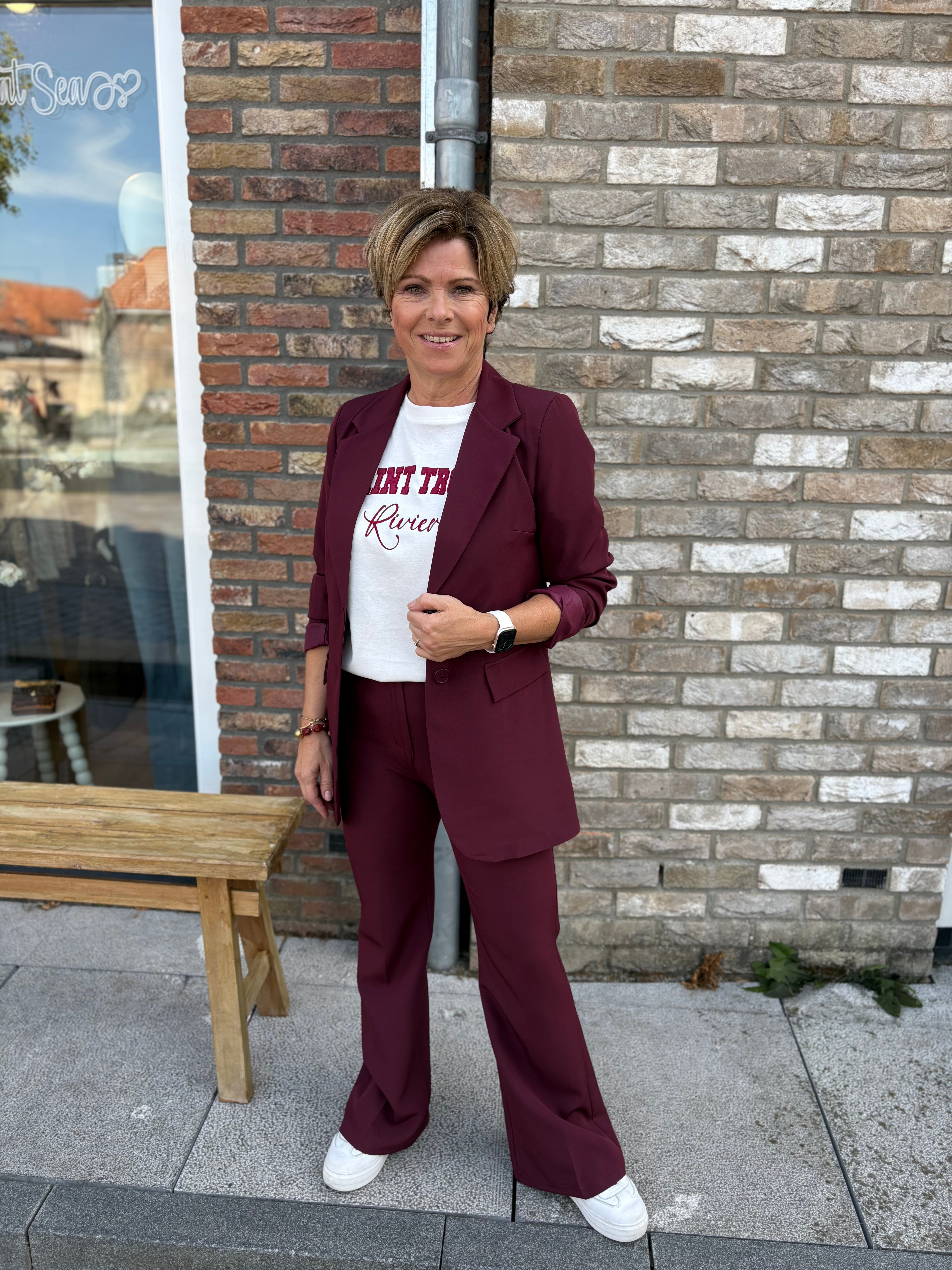Deze bordeaux blazer is een onmisbaar item in elke garderobe. Het strakke silhouet, de klassieke reverskraag en de subtiele nepzakjes aan de voorkant geven een verfijnde, minimalistische look. De blazer sluit met twee knopen en is perfect te combineren voor zowel zakelijke als casual outfits. Valt iets kleiner dan gebruikelijk.