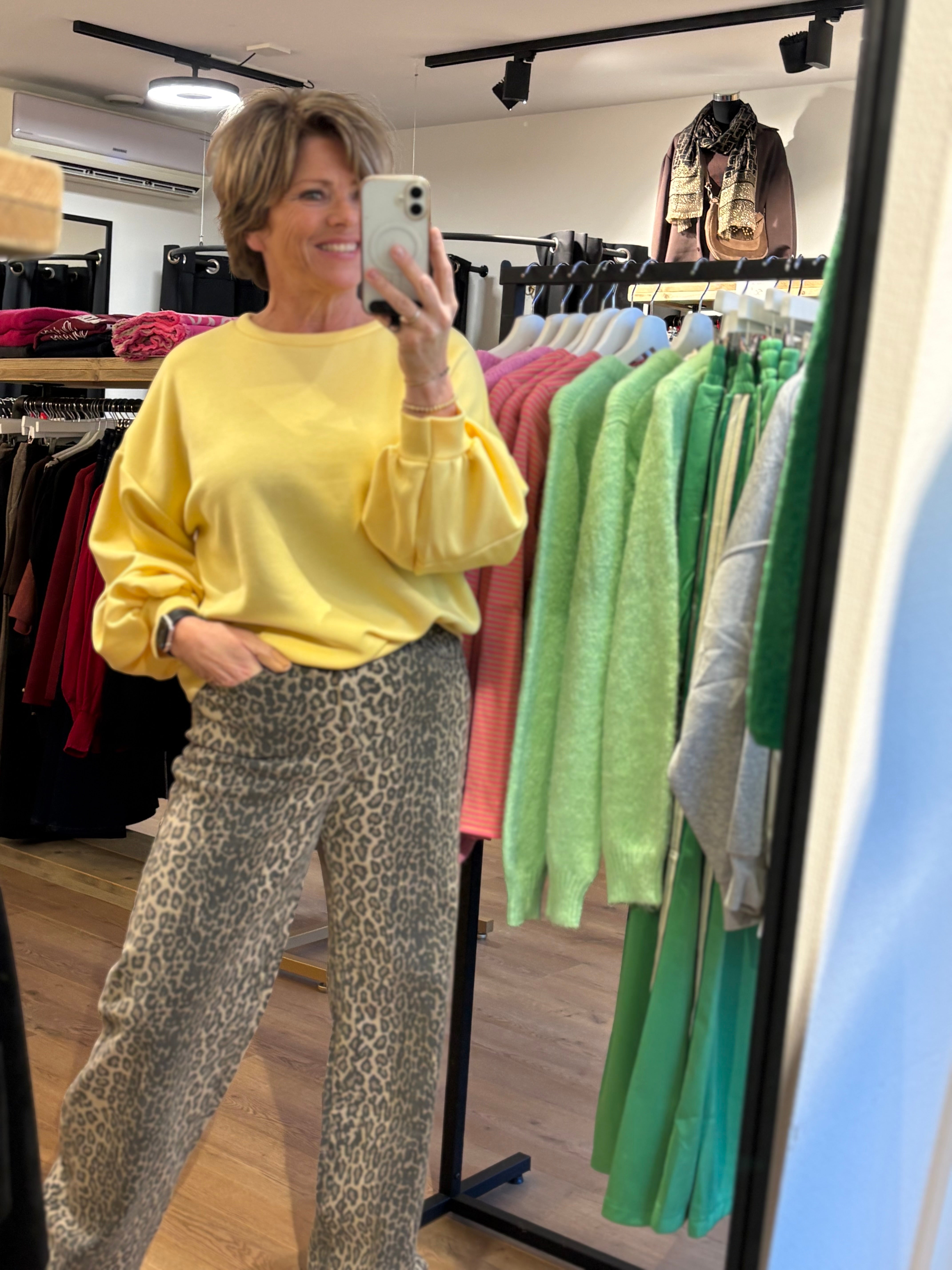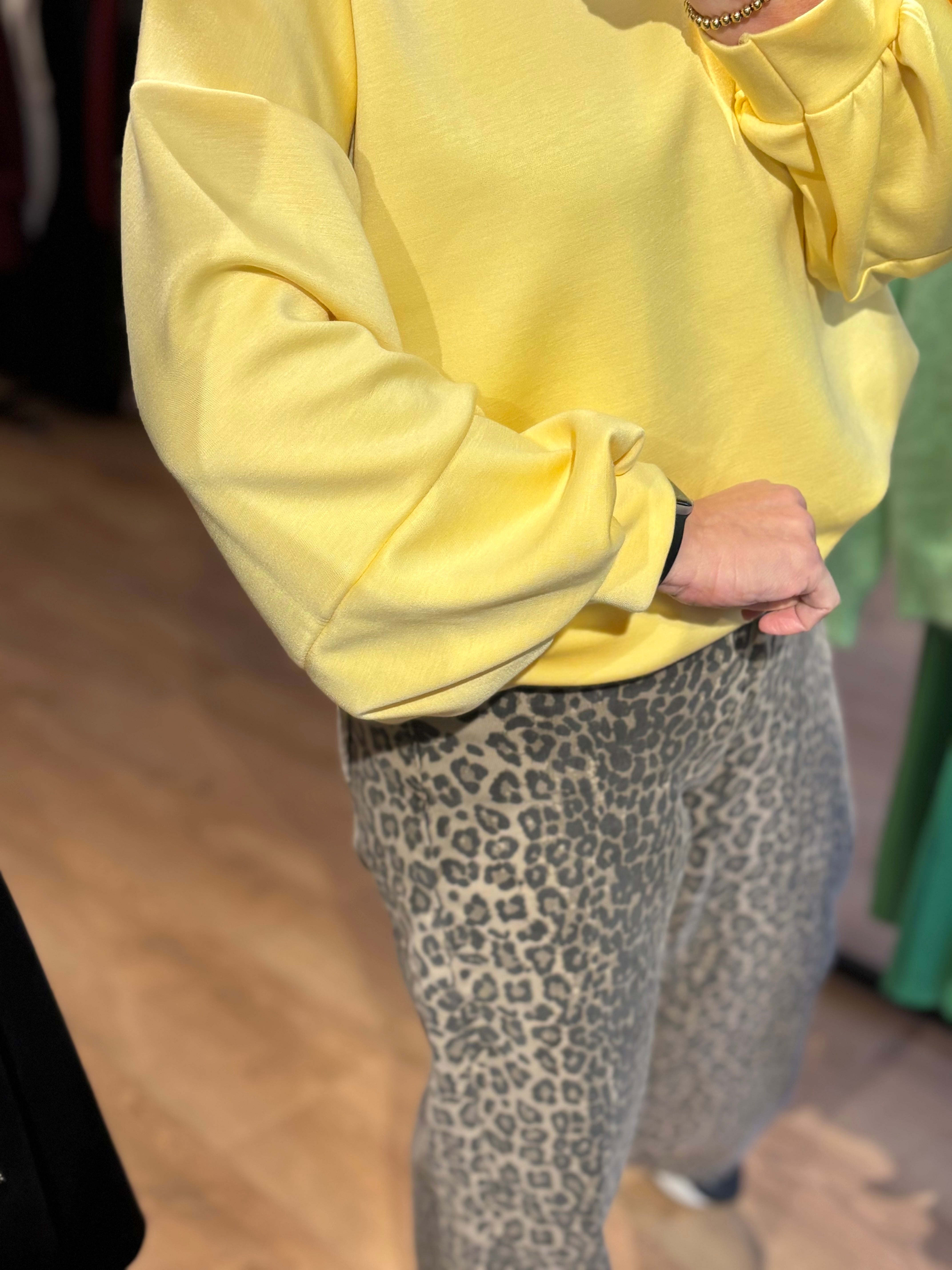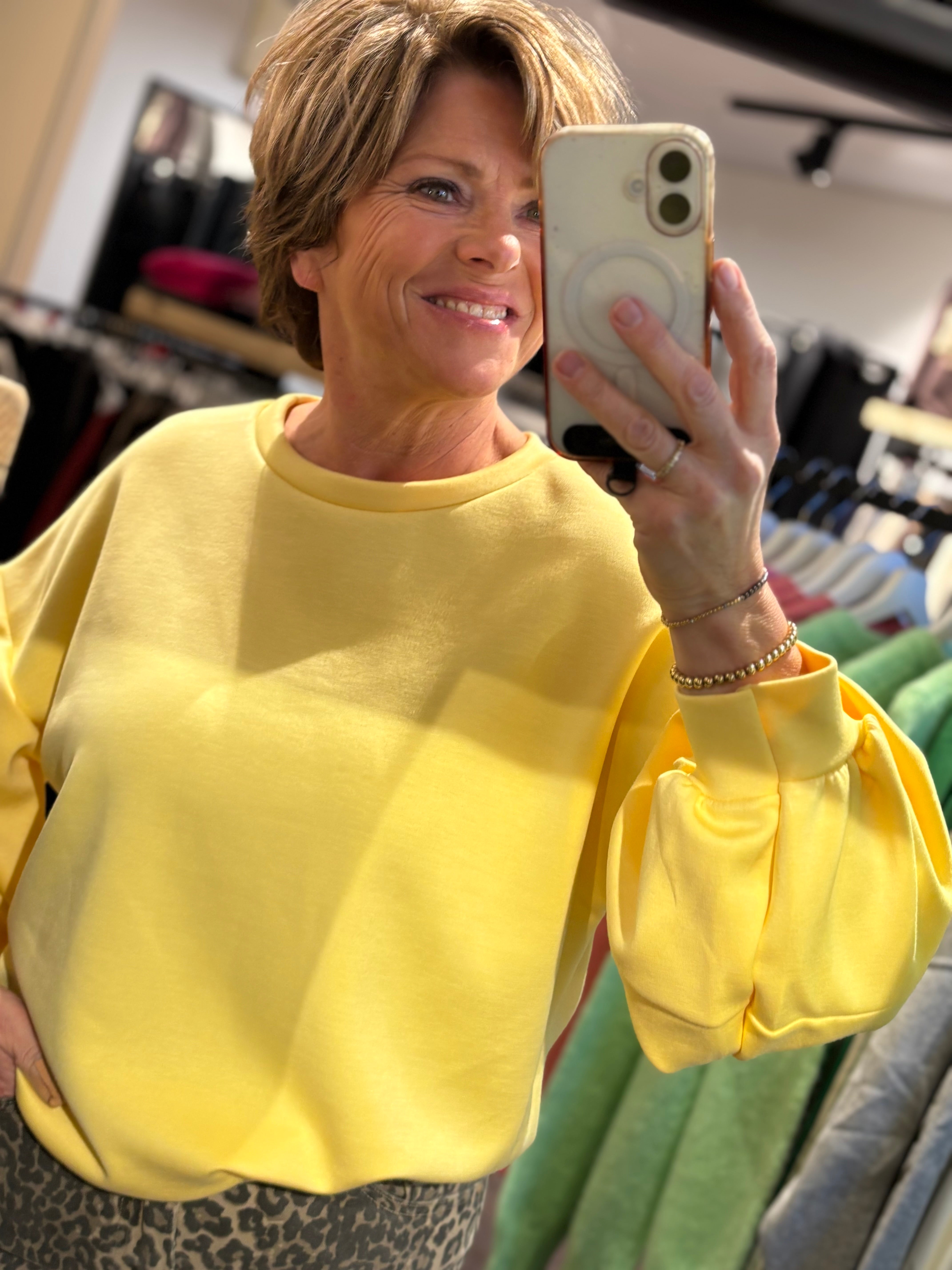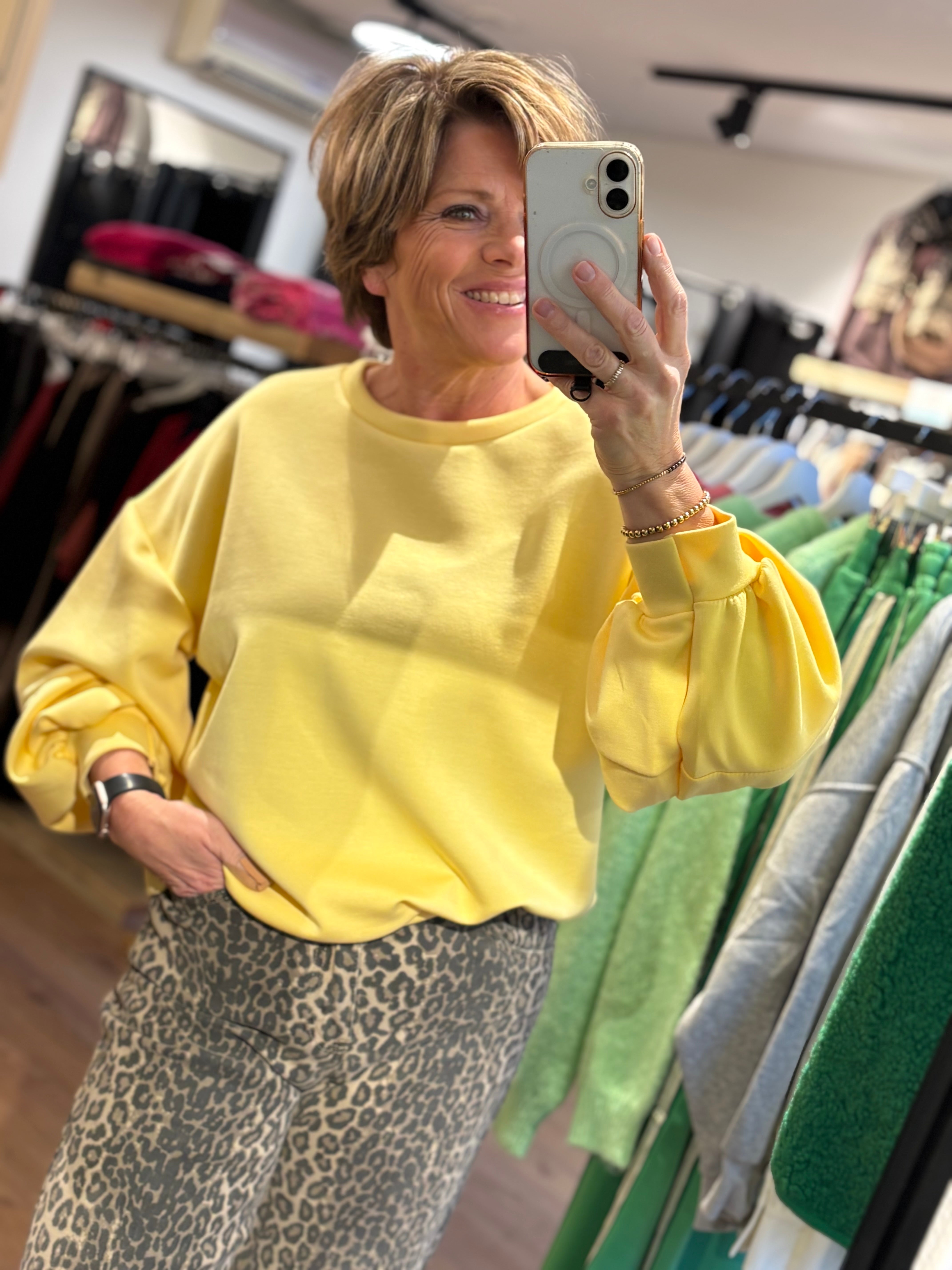 Zachte butter yellow sweater met ronde hals en one size fit. De elastische band aan de onderzijde zorgt voor een mooie pasvorm. De mouwen vallen iets korter en hebben een licht geplooid detail aan de onderkant. Comfortabel én stijlvol.
