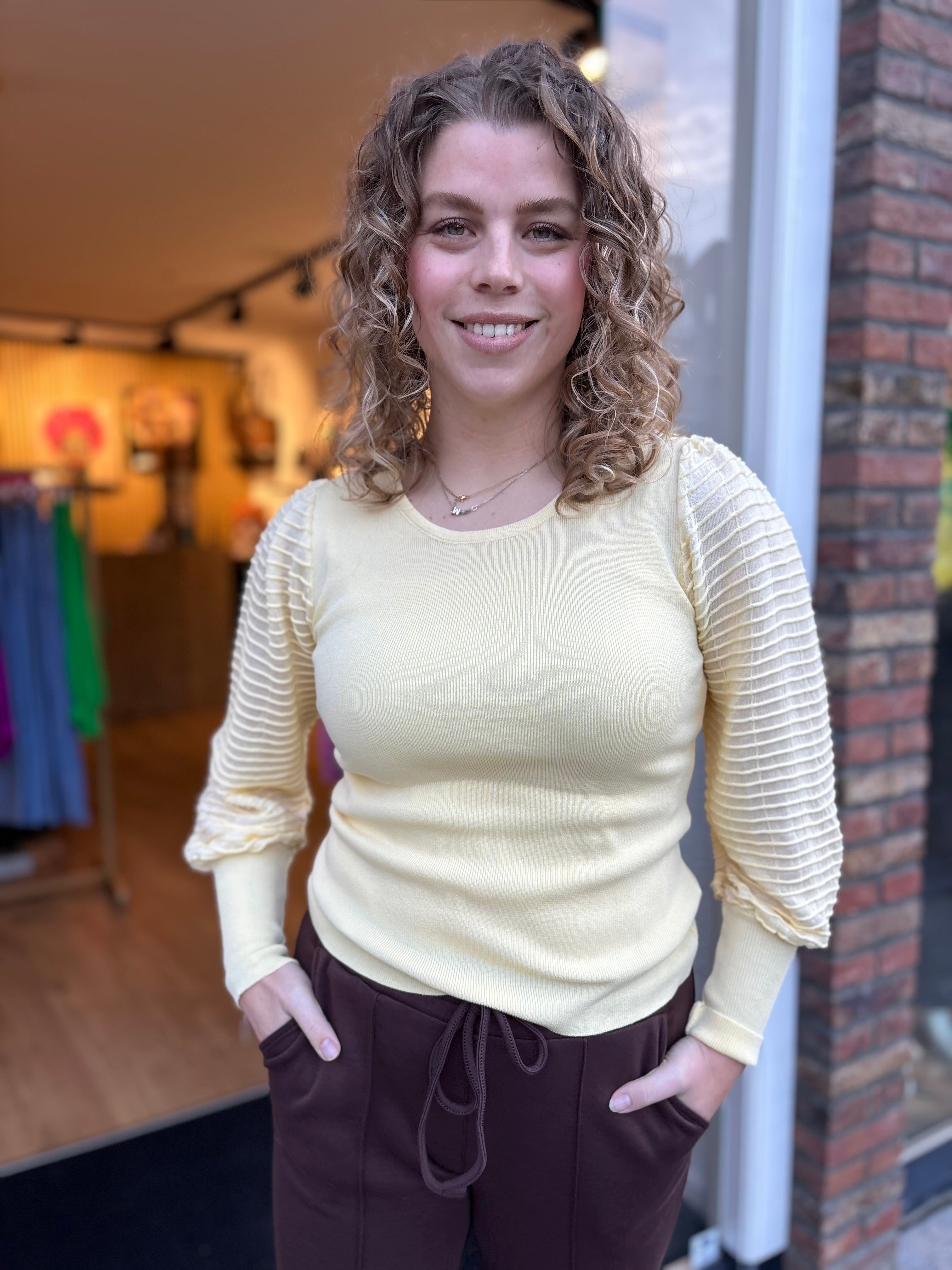 Zacht, fris en helemaal on trend: dit butter yellow truitje tilt elke outfit moeiteloos naar een hoger niveau. De aansluitende fit en ronde hals zorgen voor een clean basis design, terwijl de opengewerkte mouwen met lange elastische manchetten een subtiel statement maken. Een veelzijdige top die je het hele seizoen door wilt dragen.